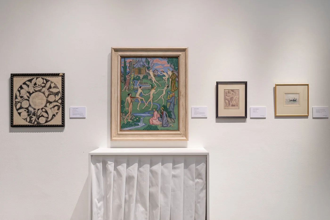 Dancers is an early modernist painting made at the advent of Post-Impressionist art in Britain. Roger Fry distinguished himself as both an intellectual and a painter, and these two activities were inseparably connected throughout his life. This work was painted around the time that Fry curated the fêted exhibition Manet and the Post-Impressionists, held at the Grafton Galleries in London, which provoked a public outcry and created a new taxonomy of modernist painting. Having previously worked in a temperate, well-constructed style of naturalistic painting informed by his deep familiarity with old master painting from Giotto to Rembrandt, Fry’s style began to change following his first exposure to Cezanne in 1906. His painting Dancers uses an eclectic mixture of avant-garde tropes—in its radical simplification of detail, its irreverent subject-matter, its flamboyant palette of pure colour—and the traditions of history painting – in its multi-figure composition, its historicist costumes, its allusions to myth or ritual.