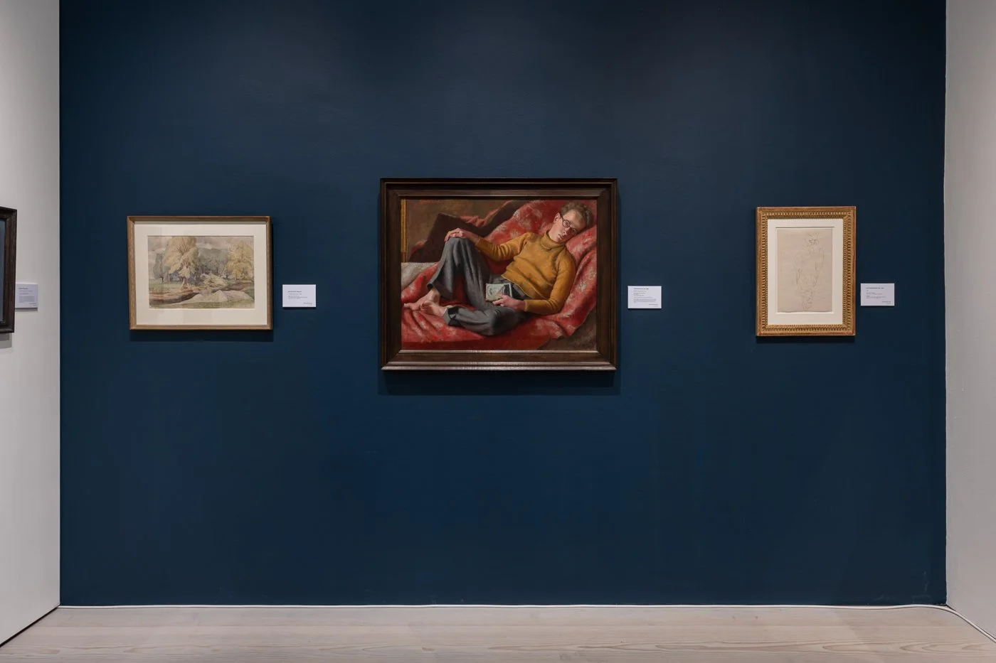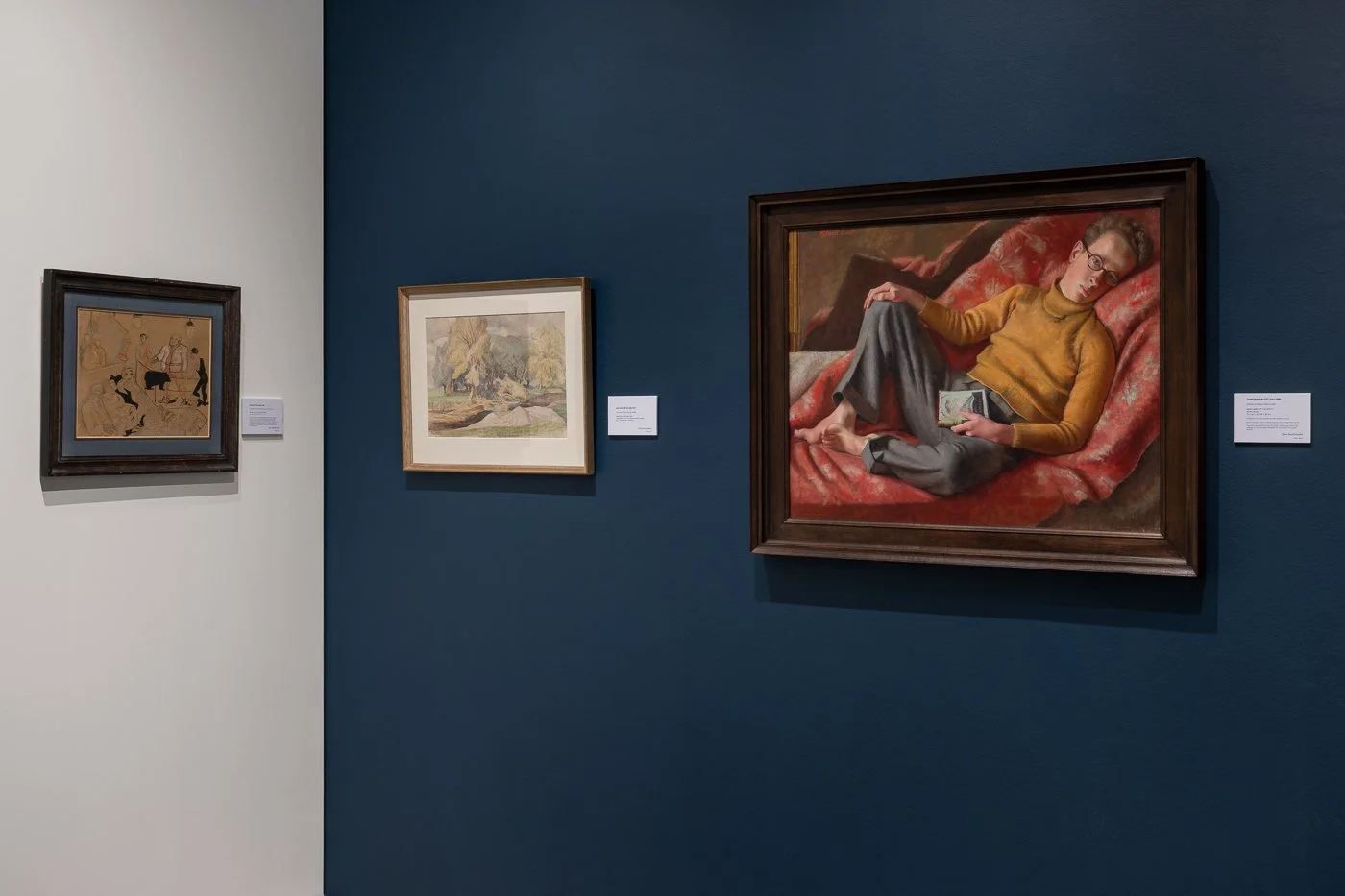 This painting demonstrates all Leet’s celebrated skill at portraiture and fine observation. The eyes – one illuminated, one in shadow – look directly at the viewer with a combination of lazy familiarity and startling intensity. The atmosphere is both theatrical and intimate: Welch is depicted in a state of charged languor, lying bare-footed on a patterned red blanket in front of a large, gilded mirror, and wearing a mustard-yellow roll-neck. The book is an especially revealing prop: a volume from the Collins edition of The Works of Oscar Wilde, with a cover by Donia Nachshen, it subtly encodes the painting’s sexuality and celebration of idleness. The painting gains added poignancy from the fact that Welch’s life-changing accident occurred later that same year. The painting stands as an elegy for the beauty of male youth soon to be irreversibly injured, as well a testament to art’s capacity to resist the felt velocity of demise.