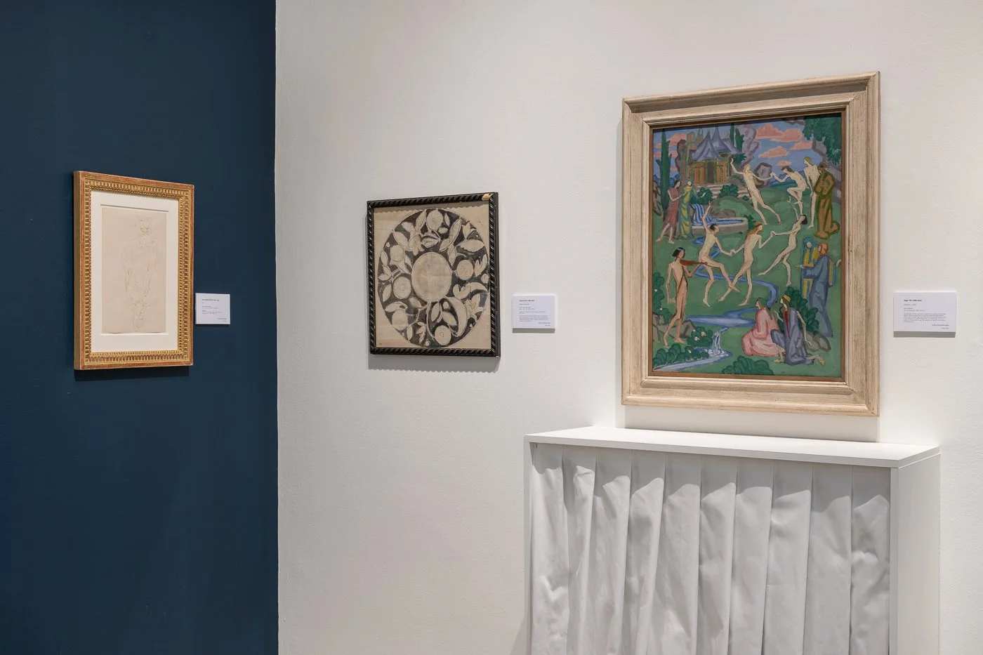 Dancers may be construed as Fry’s attempt to develop a new form of painting inspired partly by the art of Henri Matisse. Matisse’s masterpiece La Danse was exhibited at the Salon d’Automne in Paris in autumn 1910, shortly before Manet and the Post-Impressionists opened in November that year. Fry later included it in the Second Post-Impressionist Exhibition, a sequel that was also held at the Grafton Galleries.[1] The interlocking chains of naked, sensual figures have an immediate, superficial similarity to the subject of Fry’s painting. Fry’s admiration for Matisse is evident from his selection for the two Post-Impressionist exhibitions: two landscape paintings, nine sculptures and twelve drawings by Matisse were included in Manet and the Post-Impressionists, some of which were borrowed from the artist directly; as many as forty works by Matisse were included in the Second Post-Impressionist Exhibition. The execution of Dancers also strongly suggests an interpretation of Matisse. The paint was applied with flat touches in sharply defined, contrasting areas of colour. The emphasis was upon producing a decorative, uniform surface, rather than the modelling of figures or painterly structure. Fry wrote of Matisse in the catalogue for the Second Post Impressionist Exhibition: ‘In opposition to Picasso, who is pre-eminently plastic, Matisse aims at convincing us of the reality of his forms by the continuity and flow of rhythmic line, by the logic of his space relations, and, above all, by an entirely new use of colour.’[2] Fry’s analysis of Matisse’s work and his own painting experiment in Dancers suggest a conscious effort to develop his own original, modernist style with Matisse as a point of departure.